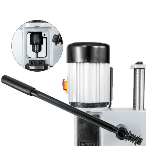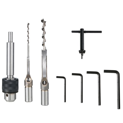 Ta dłutarka do obróbki drewna zawiera uchwyt wiertarski 13 mm ze stabilnym wiertłem, czop 3/8, uchwyt dłuta, klucz do montażu zacisku wiertła i cztery klucze sześciokątne.