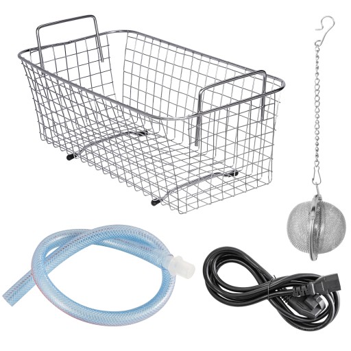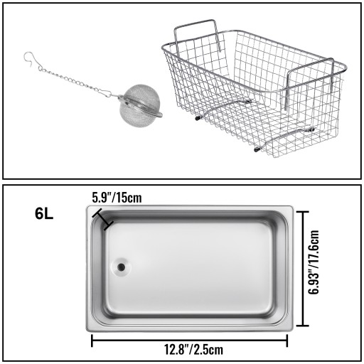 Sonic do czyszczenia biżuterii jest dostarczany ze zbiornikiem o pojemności 6 l / 1,59 gal, wyposażonym w kosz do czyszczenia biżuterii w kształcie kuli, który zmniejsza tarcie i chroni cenne przedmioty podczas prania.