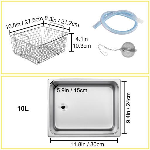 【MATERIAŁ WYSOKIEJ JAKOŚCI】 - Zbiornik: 10L; Wejście: 220V; Moc ultradźwiękowa: 120W / 240W; Częstotliwość ultradźwiękowa: 28/40 KHZ; Moc grzewcza: 300 W. Wykonana z doskonałej stali nierdzewnej, wytrzymała, antykorozyjna, odporna na rdzę i bez wycieków wody dla dłuższego czasu konserwacji.