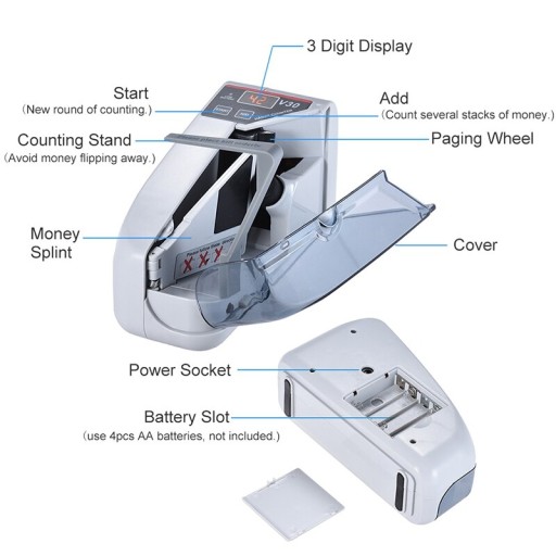 - Ta maszyna do liczenia pieniędzy jest odpowiednia dla większości światowych walut papierowych. To świetne narzędzie dla małych liczb. Ta maszyna do liczenia pieniędzy liczy tylko kwoty rachunków, a nie ilość pieniędzy.