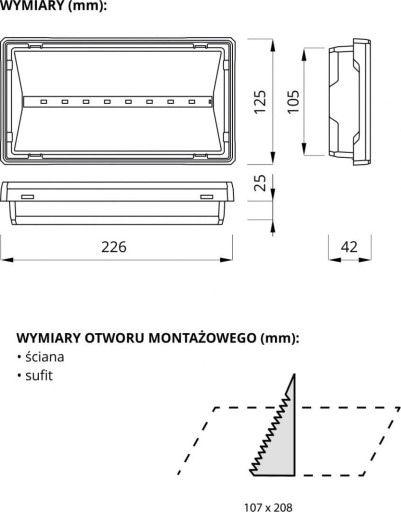 - Montaż natynkowy lub podtynkowy do ściany lub sufitu