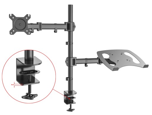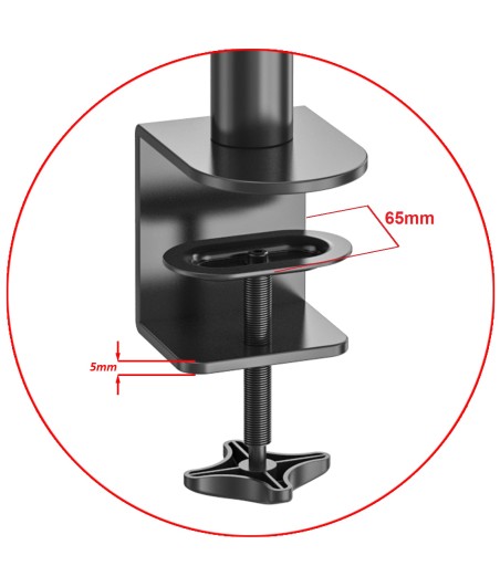 Uchwyt pozwala na montaż na skraju biurka (poprzez klamrę dociskową) pokazane na zdjęciu (grubość blatu w przedziale 20-65 mm)