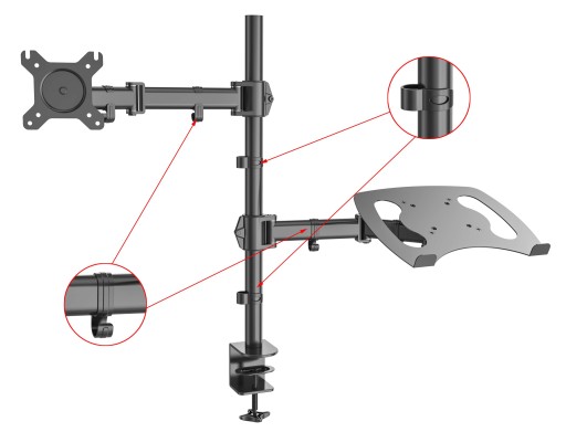 - uchwyty po obu stronach można ustawić na dowolnej wysokości oraz można je zamieniać stronami. Dodatkowo można także zamienić i zamocować podstawkę na dłuższym ramieniu a monitor na krótszym.
