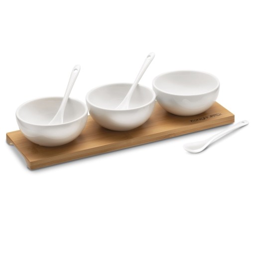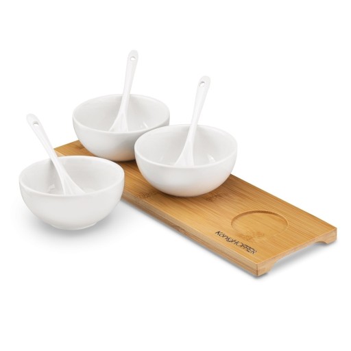 Pozostałe informacje: - miseczki i łyżeczki z porcelany NBC, wykończenie: połysk, - deska bambusowa, - elementy porcelanowe można myć w zmywarce, - deska bambusowa wyłącznie do mycia ręcznego