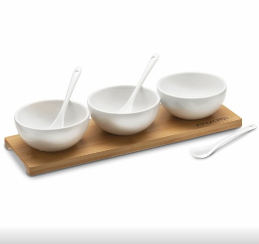 Trzy białe miseczki na dipy Konighoffer 150 ml i 3 łyżeczki – zestaw miseczek z porcelany NBC na desce bambusowej