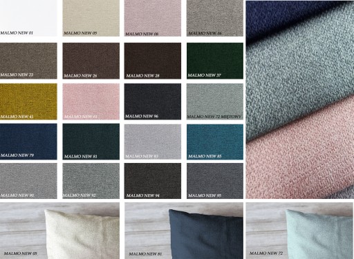 Malmo - Tkanina jest odporna na ścieranie, bardzo wytrzymała i mocna, a przy tym super miękka i przyjemna w dotyku. Dostępna jest w szerokiej, naturalnej gamie kolorystycznej: od szarości, poprzez brązy, aż do pasteli. Ma bardzo delikatną, aczkolwiek widoczną strukturę, która w wielu kolorach podkreślona jest niejednolitą barwą, uzyskaną dzięki przeplatającym się dwóm kolorom. Malmo doskonale nadaje się jako obicie całego mebla, bądź jego pojedynczego elementu lub jako materiał na stylowe, designerskie i eleganckie dodatki.