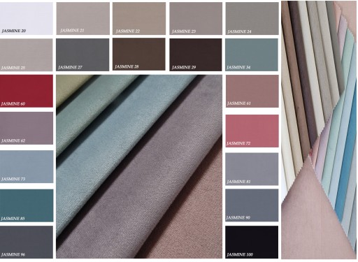 Jasmine – gładka, trudnopalna tkanina o właściwościach hydrofobowych. Bogata kolorystyka od jasnych do ciemnych szarości poprzez błękity, róże i brązy. Jasmine to gładka pluszowa tkanina meblowa o jednolitych barwach, miła i przyjemna w dotyku, odporna na ścieranie. Tkanina tapicerska wzmocniona od spodu białą siatką doskonale prezentuje się zarówno na meblach nowoczesnych jak i klasycznych, sprawdza się na także na poduszkach – zmienia położenie nitek – „cieniowanie”.