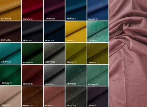 Kronos - Tkanina jest mocną, bardzo zwartą, plecioną tkaniną, dostępną w szerokiej gamie kolorystycznej z efektem delikatnego mienienia i cieniowania z włosem, co jest charakterystyczne dla tkanin welurowych. Wszystkie te cechy sprawiają, ze Kronos jest niezwykle uniwersalna pod kątem aranżacyjnym i znajduje zastosowanie nie tylko, jako obicie mebli, ale także w artykułach dekoracyjnych.