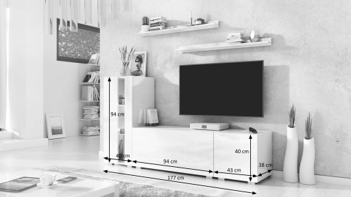 Jak to działa? Otóż system składa się z pojedynczych szafek, które w różnych konfiguracjach mogą tworzyć większe lub mniejsze zestawy. Jeśli zestaw w ofercie jest za duży lub za mały dzięki dodatkowym elementom możesz go dopasować do siebie – stworzyć własną meblościankę na wymiar.