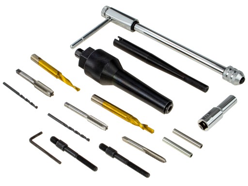 Zestaw zawiera: frezy do rozwiercania świecy, wiertła, gwintowniki, wyciągacz świecy, pokrętło z grzechotką.