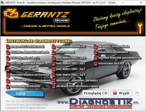 (instrukcje, lokalizacje złącz diagnostycznych w poszczególnych autach, porady diagnostyczne, w tym: kasowanie kontrolek inspekcji serwisowych i olejowych, kody błędów.) oraz nasz autorski program: Asystent Instalacji i Konfiguracji Urządzenia w wersji 2.47, z TECHNOLOGIĄ Click&Easy™
