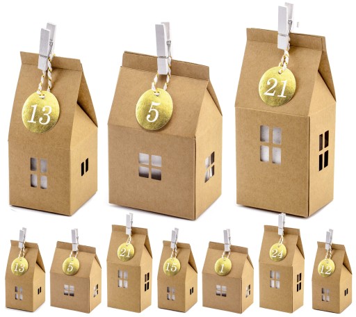 ZESTAW 24 SZTUK DOMKÓW DO SAMODZIELNEGO ZŁOŻENIA WYKONANYCH Z PAPIERU KRAFT W TRZECH RÓŻNYCH WZORACH PO 8 SZTUK Z KAŻDEGO WZORU.