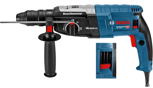 Młotowiertarka GBH 2-26 DFR marki Bosch wyposażona jest w przednią i tylną rękojeść, które są pokryte miękkim materiałem typu Softgrip. Dodatkowo posiada ona system niwelowania drgań dzięki czemu długotrwała praca staje się o wiele przyjemniejsza i wygodniejsza. Rękojeść pomocnicza pozwala zachować większą kontrolę nad narzędziem w trakcie pracy.