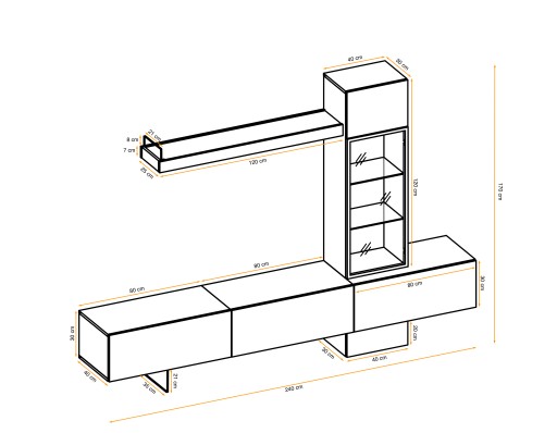 Szafka RTV: składająca się z trzech oddzielnych szafek ściennych. Każda szafka ma jedną klapę, za którą znajduje się jedna przestrzeń. Poniżej po lewej stronie znajduje się czarna metalowa noga. Półka wisząca z ozdobnym elementem metalowym. Szafka ścienna z częściowo przeszklonym frontem - czarna aluminiowa rama. Za drzwiami znajduje się jedna zwykła półka oraz dwie szklane półki podświetlane białym światłem LED. Pod szafką RTV znajduje się szafka z klapką. Wewnątrz jest jedno miejsce. System otwierania jest push-click.