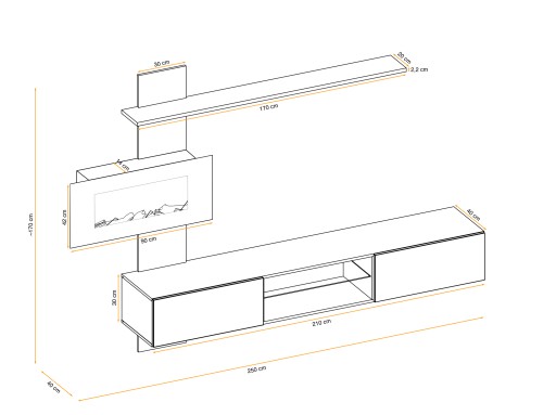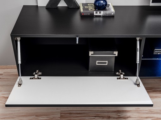 Panel ścienny, na którym montowane są: Półka, kominek elektryczny AC 220-240V 50Hz, szafka RTV: po prawej i lewej stronie znajdują się klapy, za nimi jedno miejsce. Pośrodku znajduje się otwarta przestrzeń podzielona szklaną półką oświetloną niebieskim oświetleniem LED. System otwierania Push-Click