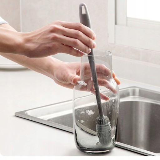 Nowoczesna, silikonowa szczotka do mycia butelek oraz innych miejsc trudno dostępnych pozwala na dokładne ich czyszczenie bez zagrożenia uszkodzenia butelek. Jest jej wykonanie z miękkiego silikonu pozwala na mycie rzeczy bez ich rysowania.