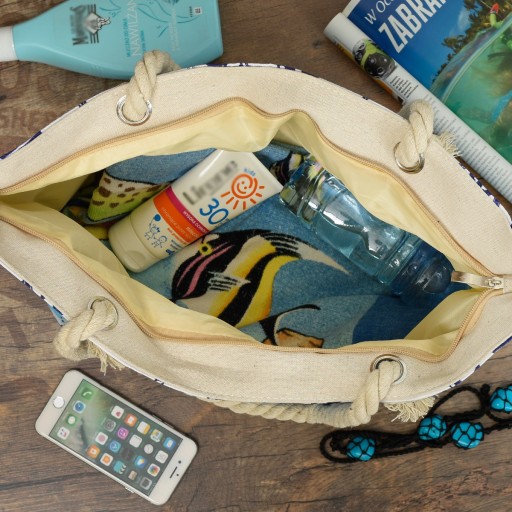 Duża , modna, nowa, torba plażowa, ważki summer idealna nie tylko na plażę, ale także na zakupy, piknik rodzinny, spacer po lesie ! Płócienna torba plażowa, lekka, ale i solidnie wykonana. Wewnątrz jest wyścielona podszewką. Wygodne, długie uchwyty/sznury sprawią, że z łatwością zarzucisz torbę na ramię Solidny zamek błyskawiczny dzięki czemu przedmioty nie będą wypadały z torby. Torba idealnie dopełni każdą letnią stylizację !