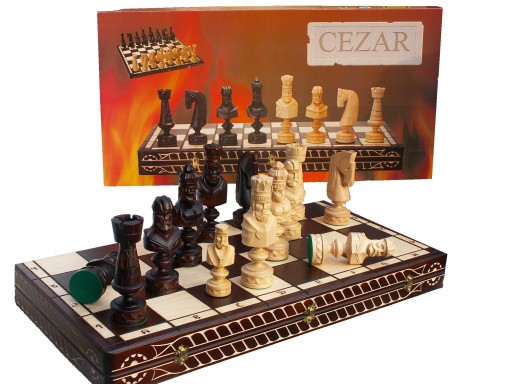 Szachy wykonane z drewna grabowego, obciążane metalem. Kaseta inkrustowana, mahoniowo-jaworowa.