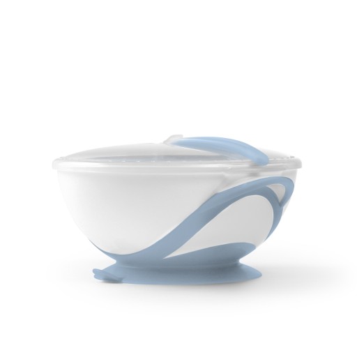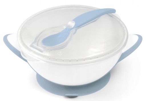Miseczka z przyssawką i łyżeczką to produkt przydatny na spacerze lub w podróży. Miękka przykrywka szczelnie chroniąca pokarm została wyposażona w system ułatwiający przechowywanie, dzięki któremu łyżeczka nie zabrudzi się, ani nie zgubi. Gumowa przyssawka uniemożliwia przesuwanie się miseczki po stole. Wykonana z bezpiecznych materiałów prze-znaczonych do kontaktu z żywnością, produkt jest całkowicie wolny od Bisfenolu A. Można ją stosować w mikrofalówce, a także myć w zmywarce.