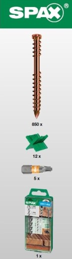 Zestaw tarasowy SPAX GREEN Box Tarasy 5x60 mm to zestaw przeznaczony zarówno do montażu deski z drewna rodzimego jak i egzotycznego o maksymalnej grubości 30 mm. Jego bazą są wkręty ze stali nierdzewnej A2 w kolorze stare złoto, które nie wymagają nawiercania w miękkim drewnie, natomiast jest ono zalecane przy drewnie twardym. Wkręty też cechuje również: