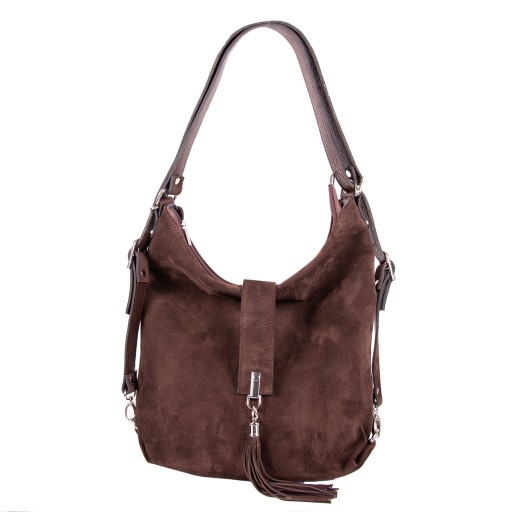 Uszyta w Polsce skórzana torebka PLECAK z wysokogatunkowej naturalnej skóry licowej z fakturą groszku połączonej z zamszem. Zamykana od góry na zamek. Wewnątrz dwie komory, dwie kieszonki na zamek + kieszonka na telefon. Z tyłu pojemna kieszeń na zamek. Wnętrze wykończone podszewką. Okucia w kolorze srebrnym. Można nosić na ramieniu jak torebkę lub na plecach jako plecak. Torebka z ozdobnym frędzlem.