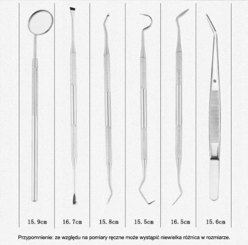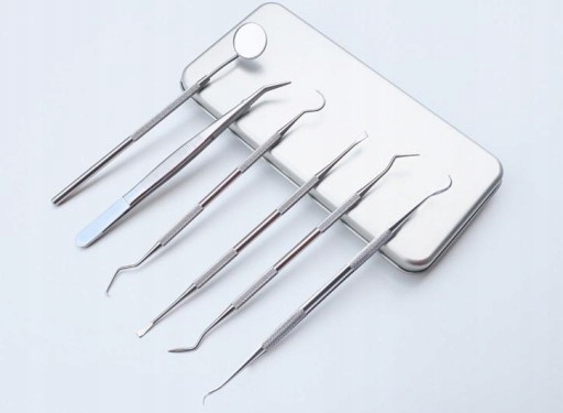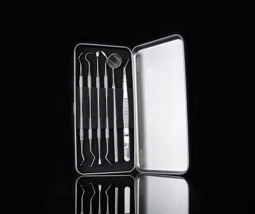 Zawiera 6 chirurgicznych narzędzi ze stali nierdzewnej - używanych przez dentystów, np. zdrapywacz kamienia nazębnego, środki do czyszczenia zębów, lusterka do ust i pincety.