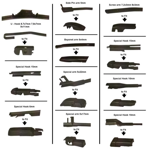 Komplet płaskich wycieraczek (piór) do szyby przedniej (2 szt.) z 20 adaptorami (po 10 dla każdego pióra).