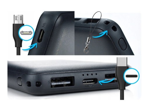 - Port microUSB - do ładowania Power Banku. Standardowy, popularny port używany w telefonach komórkowych. Port USB Typu C - do ładowania Power banku. Wyjątkowy symetryczny port stający się standardem na rynku smartfonów. Jeżeli posiadasz telefon z takim portem nie musisz już pamiętać aby mieć drugi kabel microUSB do ładowania tej przenośnej baterii. Obydwa urządzenia, telefon i power bank naładujesz swoim kablem od telefonu!