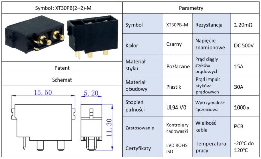 Najwyższej jakości męskie złącze połączeniowe XT30PB firmy AMASS w wersji pionowej, ze stykami sygnałowymi. Konstrukcyjnie przystosowane do montaż na płytce PCB. Stosowane do połączeń średnioprądowych. Złącze posiada 4 piny, dwa sygnałowe i dwa prądowe, stosowane do połączeń średnioprądowych (15A). Charakteryzuje się małą opornością i pewnym połączeniem. Staje się popularnym złączem dla hobbystów. Wymagane jest lutowanie dla właściwego połączenia.
