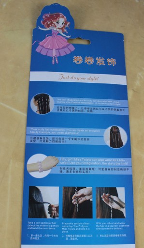 Ozdoba wykonana z elastycznego tworzywa, przypominającego gumę. Na końcu ozdoby wisiorek z koralików. Można wykorzystać również jako bransoletkę z zawieszką na rękę.