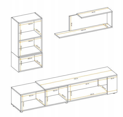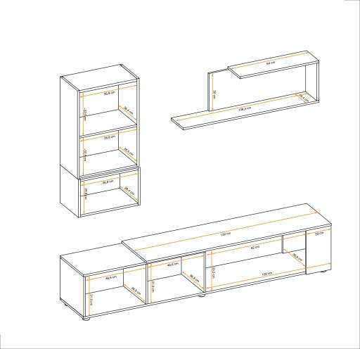 Szafka wisząca: u góry drzwi, za nimi półka (dwa miejsca), poniżej część otwarta. Szafka RTV: po lewej stronie znajduje się klapka, za nią znajdują się dwa miejsca. Półka.