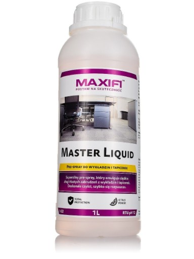 Maxifi Master Liquid 1L to supersilny pre-spray, który emulguje ciężkie złogi tłustych zabrudzeń z wykładzin i tapicerek. Doskonale czyści i jest łatwy do wypłukania.