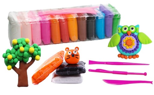W zestawie znajduje się 12 kolorów masy oraz 3 szpatułki z różnym zakończeniem. Szpatułki te ułatwią tworzenie precyzyjnych cięć masy w bezpieczny sposób.