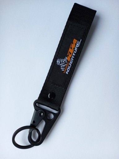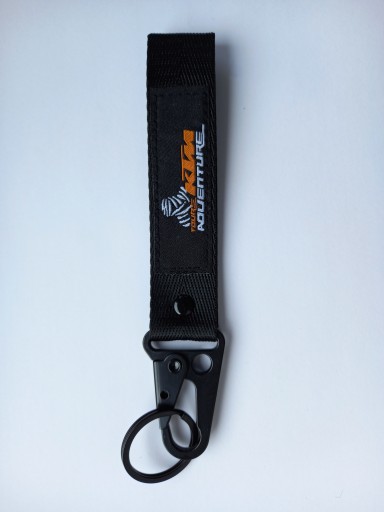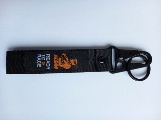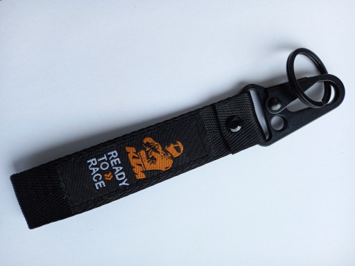 Mała zgrabna czarna smycz, smyczka, brelok na klucze z firmowymi naszywkami z obydwu stron logo KTM Ready to Race i KTM Adventure. Idealny pomysł na praktyczny i trwały prezent dla miłośnika motocyklingu i marki. Na innych aukcjach oferujemy również smycze i breloki w innych fasonach, kolorach oraz innych marek motocyklowych.