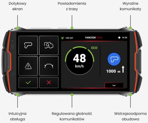 Yanosik GTm obsługujesz dotykowo, dzięki czemu interakcja z urządzeniem jest znacznie płynniejsza. Możesz dodawać swoje zgłoszenia łatwo i przyjemnie przez panel dotykowy.
