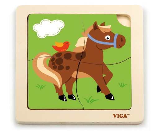 Kolorowe i bardzo proste Puzzle dla Maluszka od Viga z postacią konika. W zestawie znajdują się cztery elementy, które należy ułożyć na drewnianej podstawce. Gdy pociecha prawidłowo dopasuje kształty powstanie układanka z nowym przyjacielem. Obrazek jest w wyrazistych kolorach które przykują uwagę smyka.