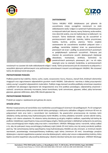 Taśma HALBAU HS03 dedykowana jest głównie do uszczelniania miejsc szczególnie narażonych na stałe oddziaływanie wody i wilgoci w systemach hydroizolacyjnych w miejscach takich jak: baseny, sauny, fontanny, oczka wodne, inne zbiorniki wodne, oraz do hydroizolacji na balkonach i na tarasach. Taśma doskonale nadaje się do uszczelnień w pomieszczeniach takich jak: łazienka, kabina prysznicowa, toaleta, kuchnia, pralnia, piwnica. Taśma znajdzie zastosowanie do uszczelnienia wszelkich połączeń ścian z podłogą, narożników (styków) ścian na powierzchniach pionowych lub ścian i podłóg na powierzchniach poziomych w podpłytkowych systemach uszczelnień. Polecana jest również do uszczelniania szczelin dylatacyjnych (dylatacje obwodowe, montażowe, strefowe, kontrolne) na powierzchniach poziomych, pionowych, jak i na ich styku wewnątrz praz na zewnątrz budynków, w pomieszczeniach narażonych na czasowe lub stałe oddziaływanie wilgoci i wody. Taśma przeznaczona jest do stosowania w połączeniu z wszystkimi płynnymi polimerowymi oraz polimerowo cementowymi masami uszczelniającymi HALBAU. Nie stosować taśmy do dylatacji konstrukcyjnych.