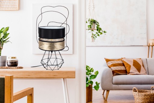 Nowoczesna lampka Jula z abażurem, pozwoli na odmianę wystroju Twojego wnętrza za niewielkie pieniądze. Abażur czarny ze złotą siatką, naklejoną na przeźroczystą folię, wprowadza ciekawy efekt światła w pomieszczeniu.