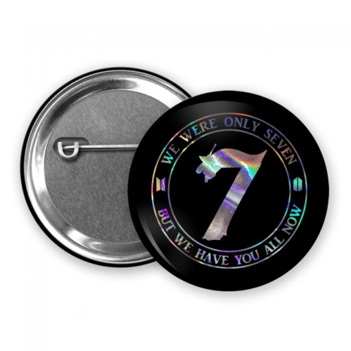 Przypinka w kształcie koła z prawdziwym połyskującym efektem holo i zdaniem We were only seven z piosenki BTS We are bulletproof : The Eternal.
