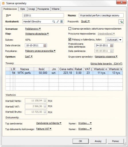 - dostęp do pełnej historii kontaktów z klientem (działania, wiadomości e-mail, wystawione dokumenty, wiarygodność płatnicza, data ostatniego kontaktu, nazwisko opiekuna klienta, wysokość udzielonych rabatów itd.);