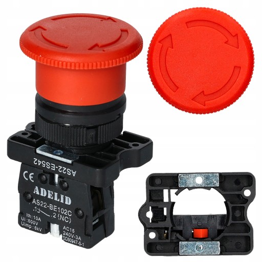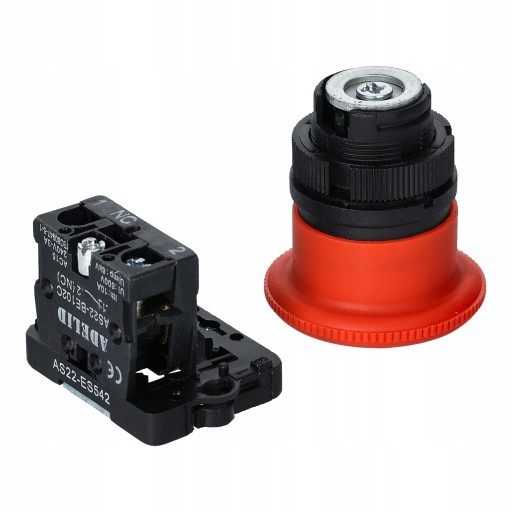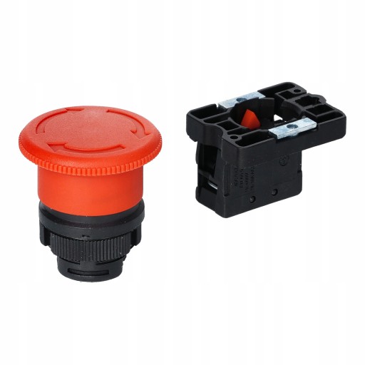 Przycisk sterowniczy awaryjny, wyłącznik bistabilny o średnicy grzybka 40mm w kolorze czerwonym został wykonany z tworzywa sztucznego. Jest on blokowany poprzez wciśnięcie grzybka i odryglowany poprzez obrót.