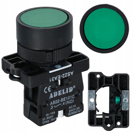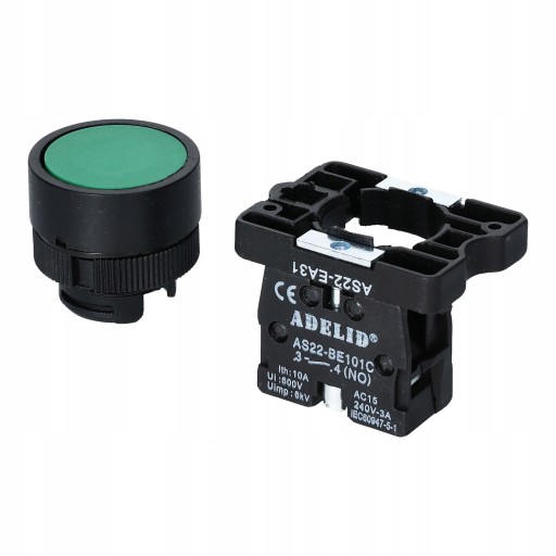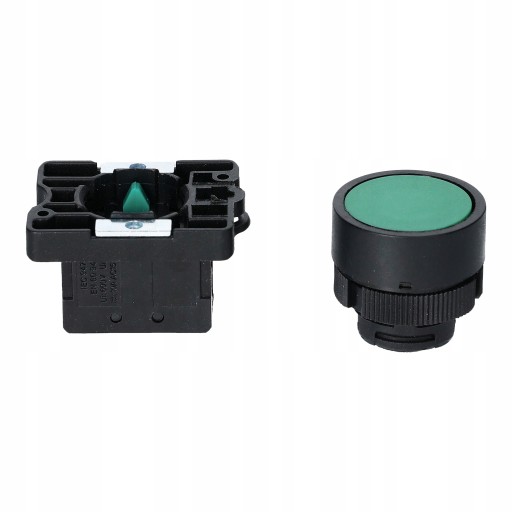 Przycisk sterowniczy START w kolorze zielonym został wykonany z tworzywa sztucznego. Średnica montażu wynosi 22mm.