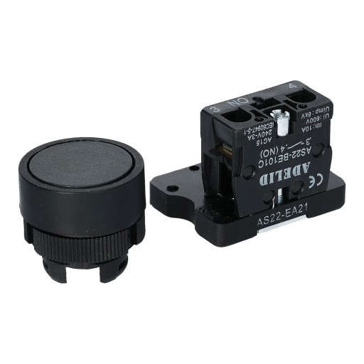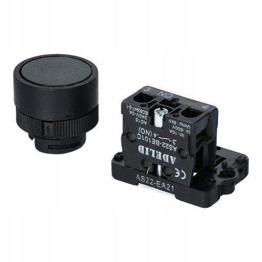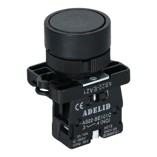 Przycisk sterowniczy w kolorze czarnym został wykonany z tworzywa sztucznego. Średnica montażu wynosi 22mm.