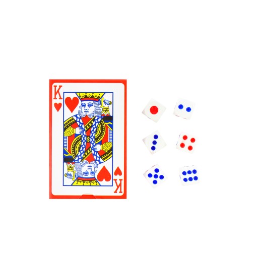 W skład zestawu wchodzi: jedna talia kart ( zawiera 54 karty) oraz 6 sztuk kości do gry!