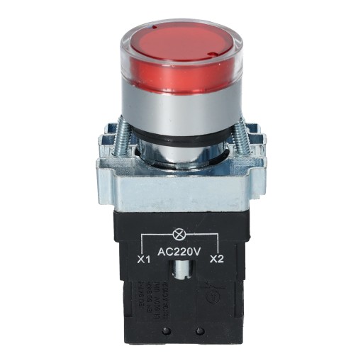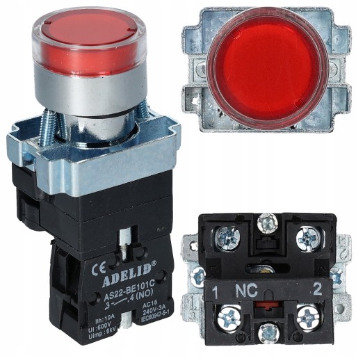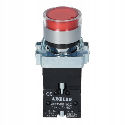 Przycisk sterowniczy z przyciskiem STOP w kolorze czerwonym podświetlanym jest wyposażony w wytrzymały, metalowy kołnierz. Średnica montażu wynosi 22mm.