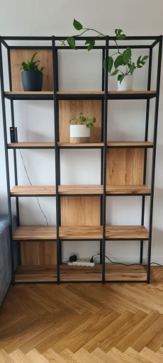 Regał dębowy rustykalny posiada sęki i pęknięcia. Jest zaolejowany olejowoskiem bezbarwnym Remmers. transportowany jest jako złożony produkt. posiada na dwóch profilach otwory montażowe od strony pleców, aby można było przytwierdzić go do ściany.