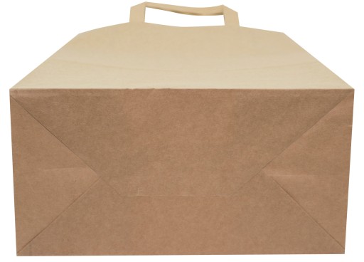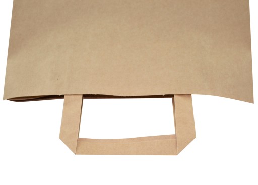 Torby papierowe z uchwytem płaskim wykonane są z brązowego papieru KRAFT, uchwyty toreb klejone wewnątrz toreb.