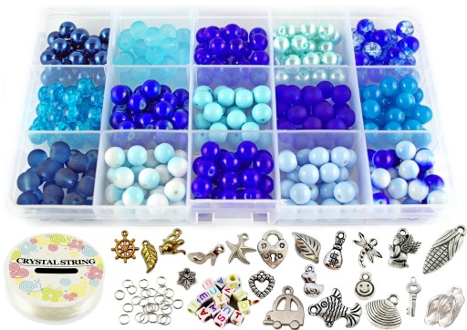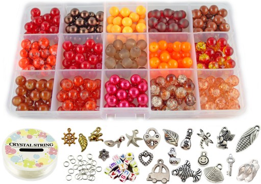 - 15 kolorów koralików szklanych po 24 sztuki w każdej przegródce. Razem 360 koralików