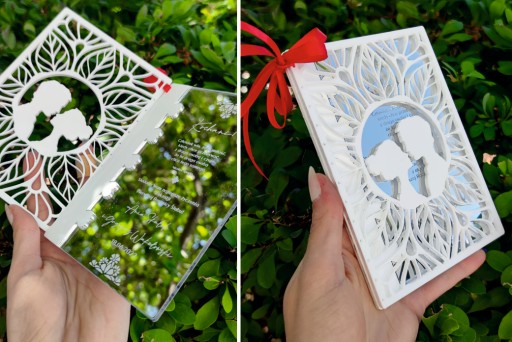 Składana kartka z ażurowym przodem z białej pleksy, druga warstwa łączona z białej pleksy i lustrzanej - do wyboru złota lub srebrna.