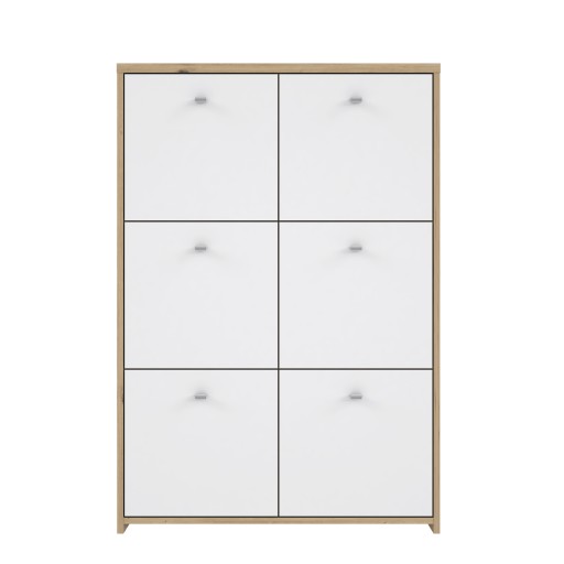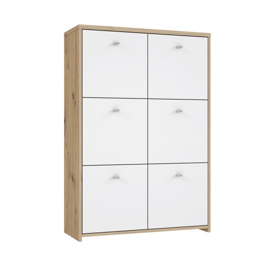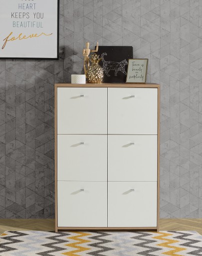 Wysoka komoda z tej kolekcji jest niezwykle funkcjonalna. Mebel ten wyposażony jest w sześć pojemnych szafek. Komoda wykonana została w dekorze Dąb Artisan z Białymi frontami.